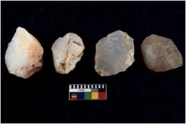 | Description / विवरण | There are n 4 utilized flake cores. There are multidirectional irregular scar pattern on both dorsal and ventral face of the flake cores. One has sharp edges and three have blunted edges. |