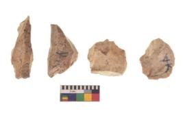| Description / विवरण | There are n 4 utilized flake cores. There are multi directional irregular scar pattern on both dorsal and ventral face of the flake cores. One has sharp edge and three have blunted edge. |