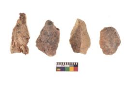 | Description / विवरण | There are n 4 utilized flake cores. There are multi directional irregular scar pattern on both dorsal and ventral face of the flake cores. Two are tapering at one end and two have blunted edges. |