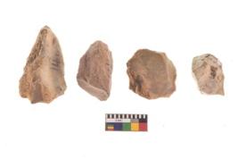 | Description / विवरण | There are n 4 utilized flake cores. There are multi directional irregular scar pattern on both dorsal and ventral face of the flake cores. One is tapering at one end and three have blunted edges. |