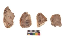 | Description / विवरण | There are n 4 utilized flake cores. There are multi directional irregular scar pattern on both dorsal and ventral face of the flake cores. One is tapering at one end and three have blunted edges. |