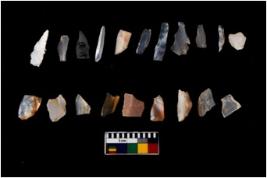 | Description / विवरण | Specimen of flakes tool with prominent flaking marks. It made up of a short flakes with sides trimmed. |