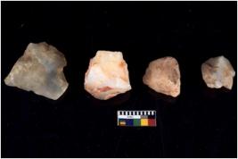 | Description / विवरण | There are n 4 utilized flake cores. There are multidirectional irregular scar pattern on both dorsal and ventral face of the flake cores. One has sharp edges and three have blunted edges. |