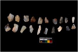 | Description / विवरण | Specimen of flakes tool with prominent flaking marks. It made up of a short flakes with sides trimmed. |