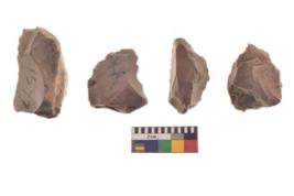 | Description / विवरण | There are n 4 utilized flake cores. There are multi directional irregular scar pattern on both dorsal and ventral face of the flake cores. One is tapering at one end and three have blunted edges. |