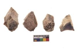 | Description / विवरण | There are n 4 utilized flake cores. There are multi directional irregular scar pattern on both dorsal and ventral face of the flake cores. One is tapering at one end and three have blunted edges. |