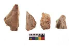 | Description / विवरण | There are n 4 utilized flake cores. There are multi directional irregular scar pattern on both dorsal and ventral face of the flake cores. One is tapering at one end and three have blunted edges. |