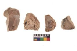 | Description / विवरण | There are n 4 utilized flake cores. There are multi directional irregular scar pattern on both dorsal and ventral face of the flake cores. One is tapering at one end and three have blunted edges. |
