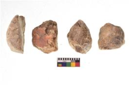 | Description / विवरण | There are n 4 utilized flake cores. There are multi directional irregular scar pattern on both dorsal and ventral face of the flake cores. One is tapering at one end and three have blunted edges. |