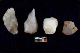 | Description / विवरण | Specimen of flake tools with prominent flaking marks. They are made up of a short flakes with sides trimmed. |