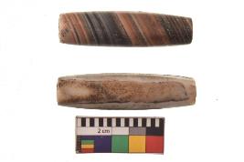 | Description / विवरण | Two barrel shape bead with spiral design and vertical lines , perforation at center |