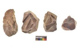 | Description / विवरण | There are n 4 utilized flake cores. There are multi directional irregular scar pattern on both dorsal and ventral face of the flake cores. Two are tapering at one end and two have blunted edges. |
