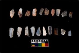 | Description / विवरण | Specimen of flakes tool with prominent flaking marks. It made up of a short flakes with sides trimmed. |