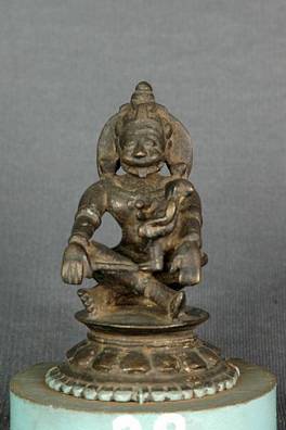 | Description / विवरण | Narasimha, the man-lion avatar of Visnu seated cross-legged with hands in yogic posture. A child is seated on his lap. Next image is the backside of it. |