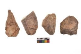 | Description / विवरण | There are n 4 utilized flake cores. There are multi directional irregular scar pattern on both dorsal and ventral face of the flake cores. One has sharp edge and three have blunted edge. |