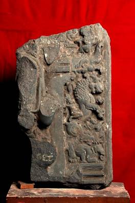 | Description / विवरण | Fragment of a stele depicting an icon, probably Visnu. "Elephant, griffin and figures are depicted. |