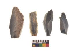 | Description / विवरण | There are n 4 utilized flake cores. There are multi directional irregular scar pattern on both dorsal and ventral face of the flake cores. All of them are tapering at one end. |