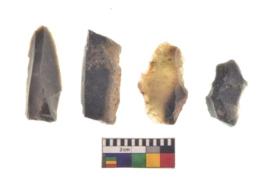 | Description / विवरण | There are n 4 utilized flake cores. There are multi directional irregular scar pattern on both dorsal and ventral face of the flake cores. All of them are tapering at one end. |