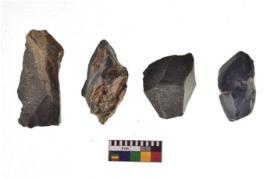 | Description / विवरण | There are n 4 utilized flake cores. There are multi directional irregular scar pattern on both dorsal and ventral face of the flake cores. Three are tapering at one end and one has blunted edge. |