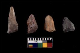 | Description / विवरण | There are n 4 utilized flake cores. There are multidirectional irregular scar pattern on both dorsal and ventral face of the flake cores. One has sharp edges and three have blunted edges. |