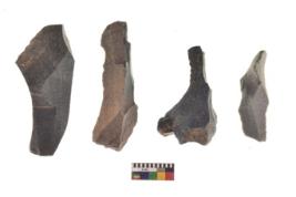 | Description / विवरण | There are n 4 utilized flake cores. There are multi directional irregular scar pattern on both dorsal and ventral face of the flake cores. All of them are tapering at one end. |