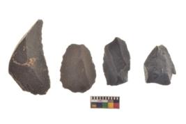 | Description / विवरण | There are n 4 utilized flake cores. There are multi directional irregular scar pattern on both dorsal and ventral face of the flake cores. One is tapering at one end and three have blunted edges. |