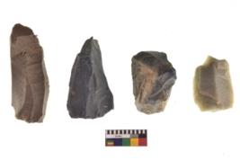 | Description / विवरण | There are n 4 utilized flake cores. There are multi directional irregular scar pattern on both dorsal and ventral face of the flake cores. All of them are tapering at one end. |