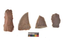 | Description / विवरण | There are n 4 utilized flake cores. There are multi directional irregular scar pattern on both dorsal and ventral face of the flake cores. Two are tapering at one end and two have blunted edges. |