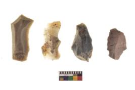 | Description / विवरण | There are n 4 utilized flake cores. There are multi directional irregular scar pattern on both dorsal and ventral face of the flake cores. All of them are tapering at one end. |