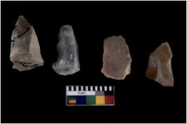 | Description / विवरण | Specimen of flake tools with prominent flaking marks. They are made up of a short flakes with sides trimmed. |