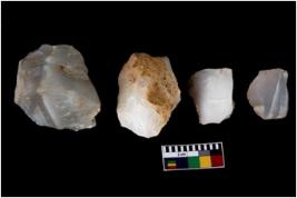| Description / विवरण | There are n 4 utilized flake cores. There are multidirectional irregular scar pattern on both dorsal and ventral face of the flake cores. One has sharp edges and three have blunted edges. |