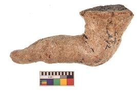 | Description / विवरण | Specimen of a handmade handle slightly carved from one side with a tapering end, lime coated, well fired. |