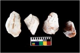 | Description / विवरण | There are n 4 utilized flake cores. There are multidirectional irregular scar pattern on both dorsal and ventral face of the flake cores. One has sharp edges and three have blunted edges. |