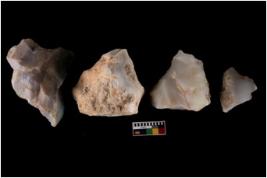 | Description / विवरण | There are n 4 utilized flake cores. There are multidirectional irregular scar pattern on both dorsal and ventral face of the flake cores. One has sharp edges and three have blunted edges. |
