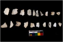 | Description / विवरण | Specimen of flakes tool with prominent flaking marks. It made up of a short flakes with sides trimmed. |