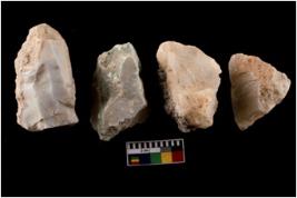 | Description / विवरण | There are n 4 utilized flake cores. There are multidirectional irregular scar pattern on both dorsal and ventral face of the flake cores. One has sharp edges and three have blunted edges. |