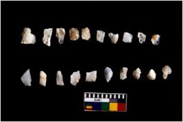 | Description / विवरण | Specimen of flakes tool with prominent flaking marks. It made up of a short flakes with sides trimmed. |