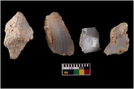 | Description / विवरण | There are n 4 utilized flake cores. There are multidirectional irregular scar pattern on both dorsal and ventral face of the flake cores. One has sharp edges and three have blunted edges. |