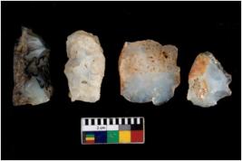 | Description / विवरण | There are n 4 flake cores. All of them are fully fluted flake cores without any trace of crested ridge flakes. Some are tapering at one end and some have sharp edges. |