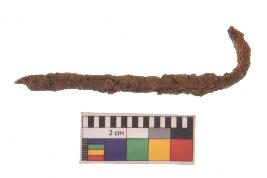 | Description / विवरण | Specimen of a heavily rusted hook with carved head and having rectangular cross section. |