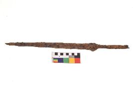 | Description / विवरण | Specimen of a heavily rusted tanged knife with tapering end and having rectangular cross section |