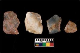 | Description / विवरण | There are n 4 flake cores. All of them are fully fluted flake cores without any trace of crested ridge flakes. Some are tapering at one end and some have sharp edges. |