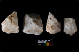 | Description / विवरण | There are n 4 utilized flake cores. There are multidirectional irregular scar pattern on both dorsal and ventral face of the flake cores. One has sharp edges and three have blunted edges. |