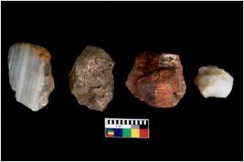 | Description / विवरण | There are n 4 flake cores. All of them are fully fluted flake cores without any trace of crested ridge flakes. Some are tapering at one end and some have sharp edges. |