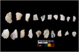 | Description / विवरण | Specimen of flakes tool with prominent flaking marks. It made up of a short flakes with sides trimmed. |