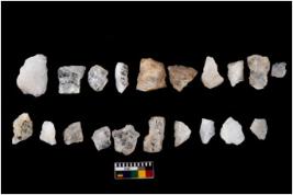 | Description / विवरण | Specimen of flakes tool with prominent flaking marks. It made up of a short flakes with sides trimmed. |