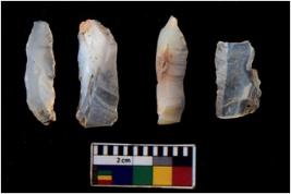 | Description / विवरण | Specimen of flakes tool with prominent flaking marks. It made up of a short flakes with sides trimmed. |