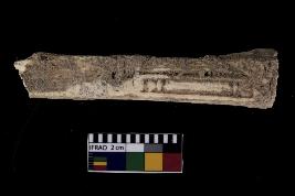 | Description / विवरण | Bone object with vertical lines at bottom flower pattern design with centric dot. |