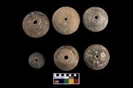 | Description / विवरण | Areca nut bead of terracotta, flat base, centrally perforated. |