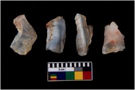 | Description / विवरण | Specimen of flakes tool with prominent flaking marks. It made up of a short flakes with sides trimmed. |